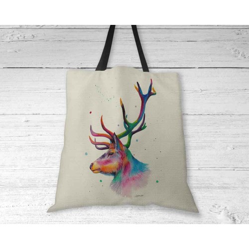 Our Majestic Colour Stag tote bag features a beautiful reproduction of the artists' original work professionally printed onto a canvas effect shoulder handle tote bag.