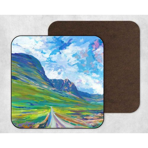 Our Road To Applecross coaster features a beautiful reproduction of the artists' original work professionally printed onto a set of four full size coasters.