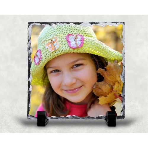 As images are infused directly into the slate, the print may follow the spots, dips, and bumps of the natural slate. Photo slate prints are scratch and abrasion resistant, and come with a stand for display in both portrait and landscape orientation.